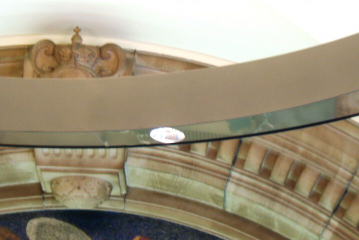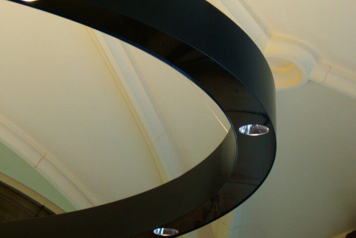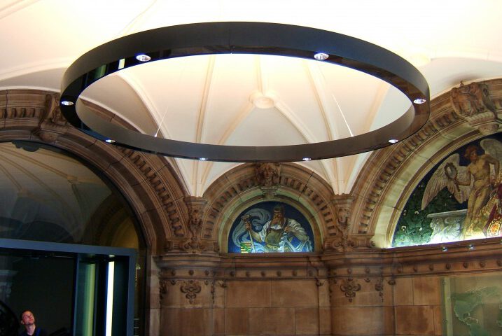 Leuchter, D= 3500mm, mit direktem und indirektem Licht. Programmierbar und mit Tageslichtsteuerung. Edelstahl hochglänzend und Edelstahl lackiert. Mit spezieller Aufhängung für bauseits vorhandene, sehr alte UK. Empfang Baumwollbörse Bremen